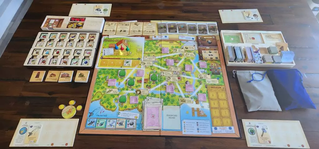 A standard game spanning one year will take around 45 minutes per player, but it’s possible to speed this up if needed. To slice the game’s time in half, use only two Season Cards, two of Grandpa’s Goals, and three random Community Center goals.
