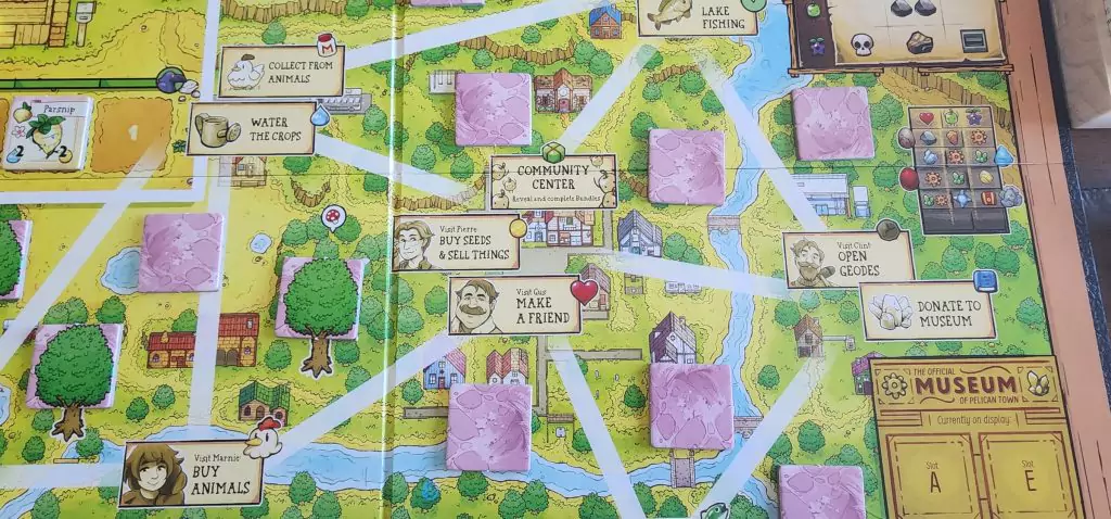 - Donate to Museum – If you’ve discovered any Minerals or Artifacts, you can donate them to the Museum by visiting Gunther. Spend one action to place the Mineral or Artifact on the corresponding letter at the Official Museum of Pelican Town.